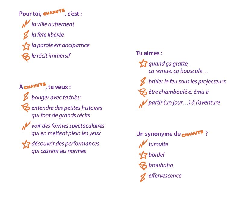 Tu as rempli le questionnaire disponible à la fin de la plaquette du festival et tu souhaites savoir quel Chahuts sommeille en toi ? Tu es sur la bonne page ! Comptabilise tes réponses et reporte-toi aux pictos pour découvrir quels sont les rendez-vous artistiques du festival qui sont prévus pour toi.