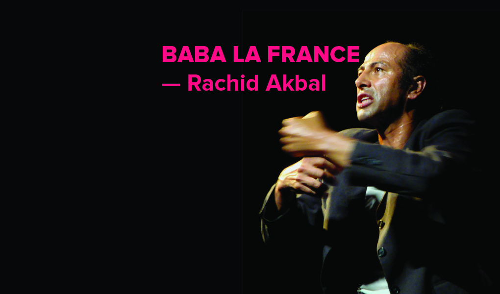Baba la France est une écriture cyclique, un tourbillon infernal qui nous précipite vers une fin déjà annoncée. De novembre 54 à octobre 61, les évènements s’accélèrent et nous montrent l’horreur de la guerre décrite à travers le regard d’un enfant. Accompagné par le jeu nuancé des lumières, qui libère l’espace ou enferme le personnage, et une bande son qui mêle des lignes mélodiques et des bruits d’usine ou d’eau qui coule, Rachid Akbal livre une performance physique dont personne ne sort totalement indemne.